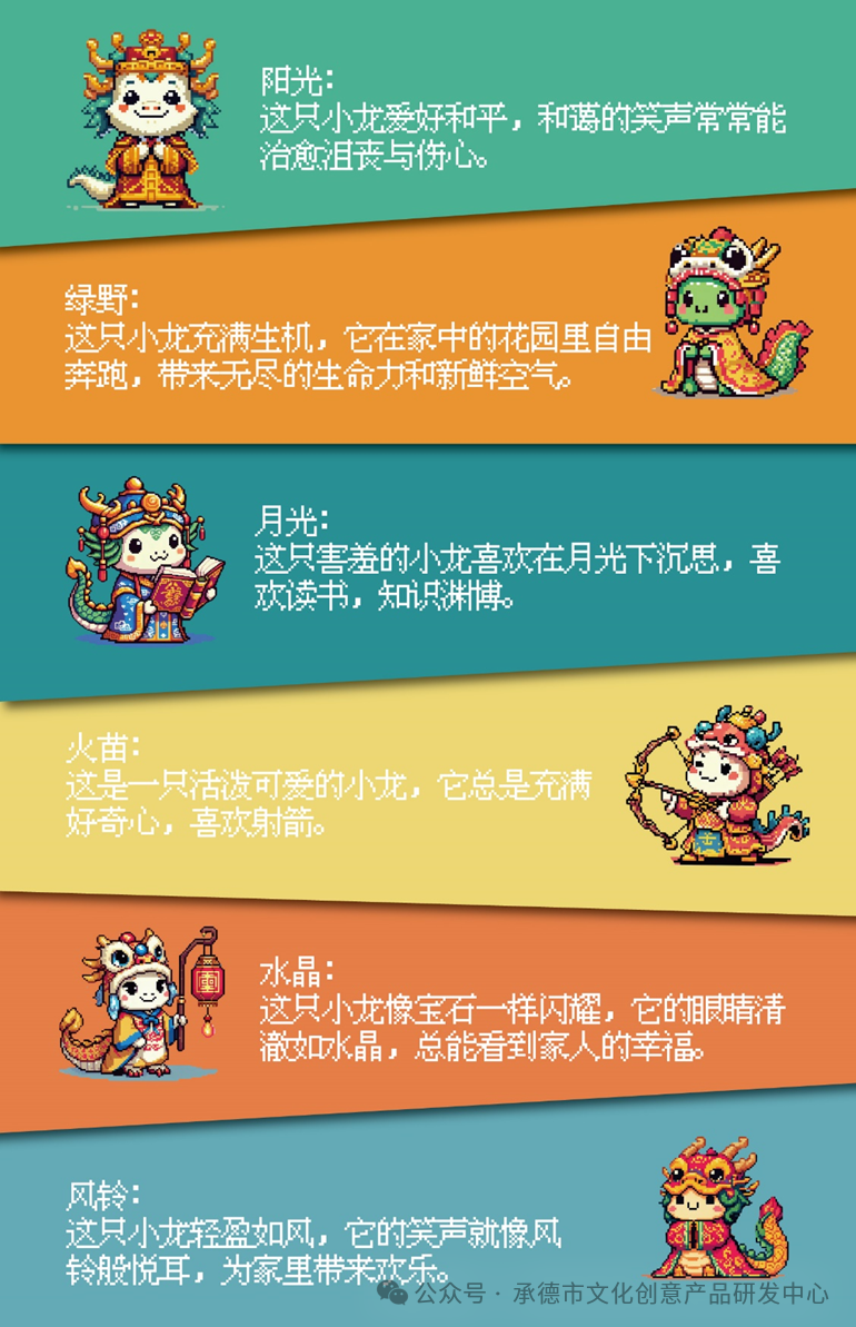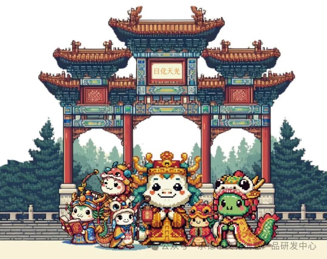 该系列IP设计理念是将中国龙的传统形象与当下流行的像素艺术风格相结合,打造出一款新颖而富有创意的萌宠IP。通过对龙的形象进行现代化的像素化处理,使其既具有传统文化的韵味,又不失可爱和趣味性。首先,在色彩上,选用了代表中国传统的红色和金色作为主色调,以及绿色和蓝色作为辅助色彩,这些色彩的组合不仅富有中国特色,也能够在视觉上产生强烈的冲击力和吸引力。另外,为了增加IP的深度和粉丝的参与感,龙年萌宠系列IP构建了一个有趣的故事背景。在这个故事中,每一个龙年的萌宠都是一位幸运的使者,它们在龙年中被选中,肩负着为人们带来好运和幸福的使命,与角色故事相搭配的场景设计采用了具有承德特色的传统古建筑作为设计灵感来源,例如头道牌楼、金山岭长城、小布达拉宫、避暑山庄园林小品等建筑形式,同样作像素化处理,突出展现了承德古建筑的魅力与特色。