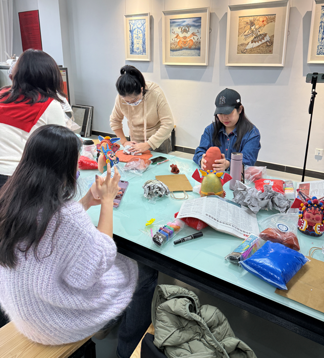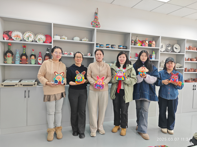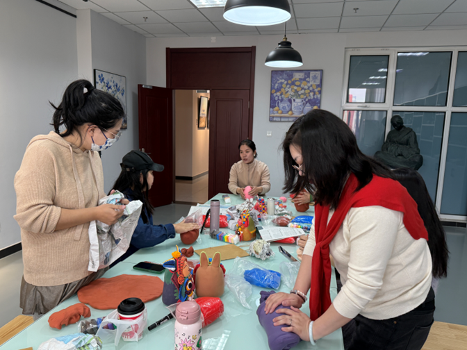 泥塑工作台前,陶瓷陶印工作室负责人许静老师正在演示"三分塑形七分神"的秘诀。女教职工们揉捏着超轻纸黏土。揉搓、塑形、雕琢,她们褪去讲台上的严谨,任由黏土在掌心流转。捏出一尊尊憨态可掬的“兔儿爷娃娃”,并笑言:“这黏土里仿佛有温度,让人想起小时候姥姥捏的面人。